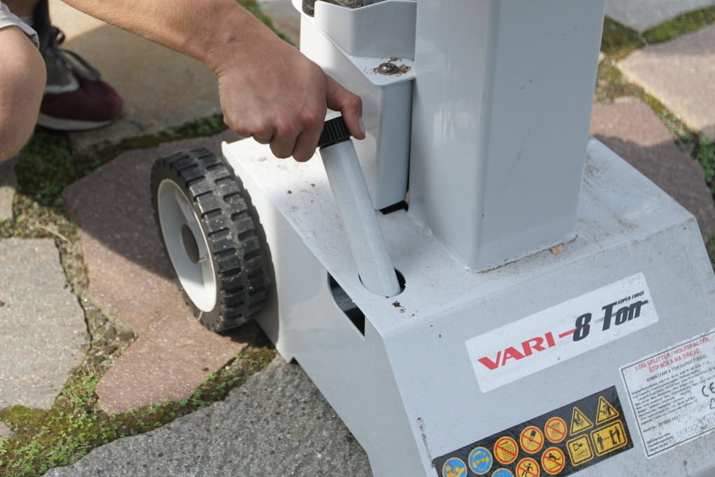 Łuparka VARI 8 TON SUPER FORCE spełnia nowy europejski standard bezpieczeństwa pracy. Oprócz standardowej obsługi oburęcznej dodano nowe, mocniejsze nogi stablizujące podczas łupania oraz przedłużony blat roboczy.